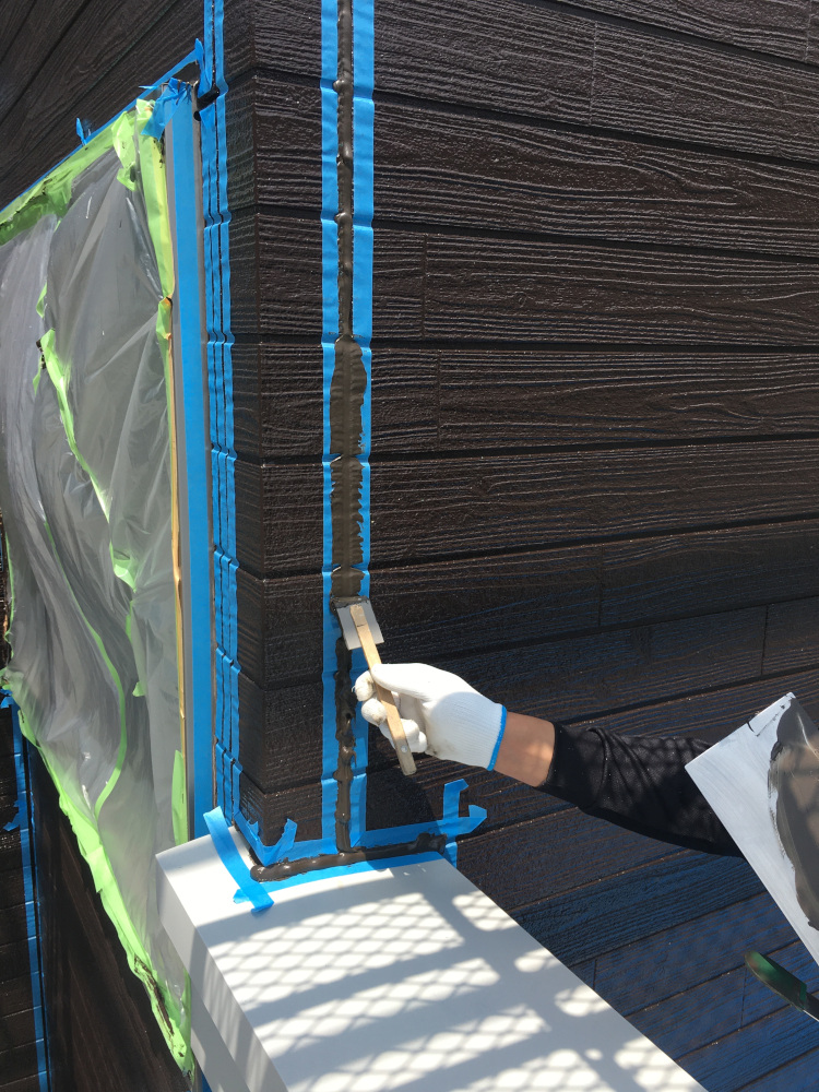 コーキング部分をチェックしたところ、経年劣化により亀裂が出ている部分もありました。劣化したシーリングを綺麗に剥がし、シーリングが密着するようにプライマーをしっかりと塗りました。綺