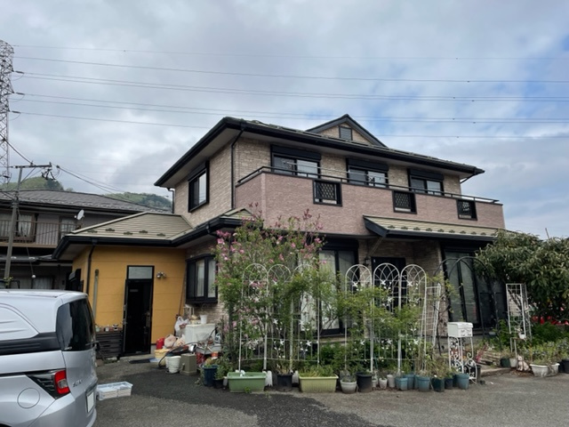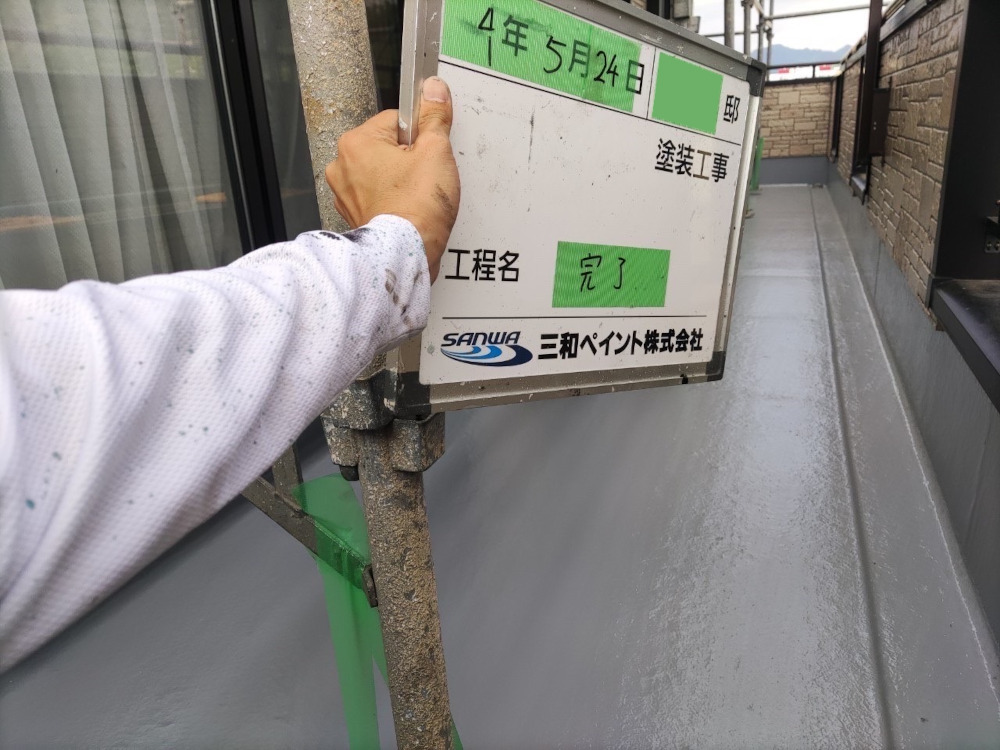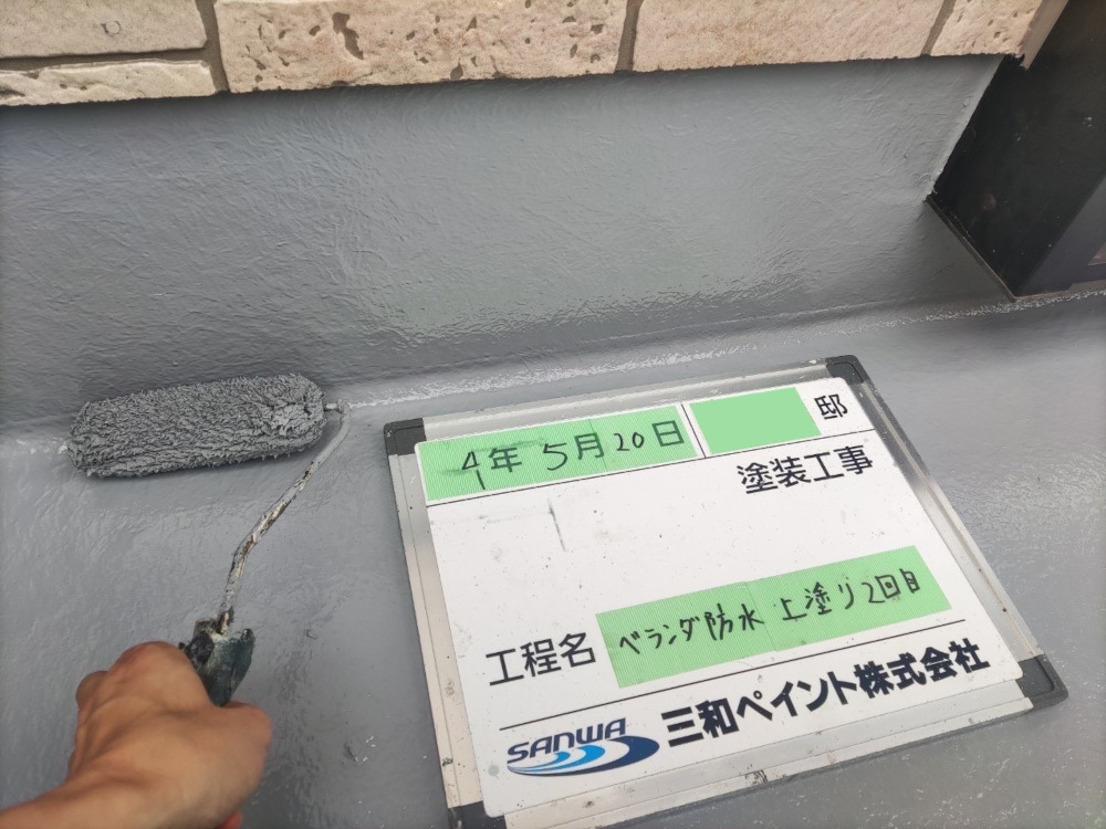 今回のお住まいは新築時FRP防水がされていました。防水層が割れたり、雨漏りが発生していたわけではないので、防水層に対する床塗装を施工しました。屋根の上には瓦が乗っていてそれで水から守っていますが、ベランダはグレー色の防水層が瓦の代わりになっています。ベランダは歩いたりもしますので定期的なメンテナンスは必要です。