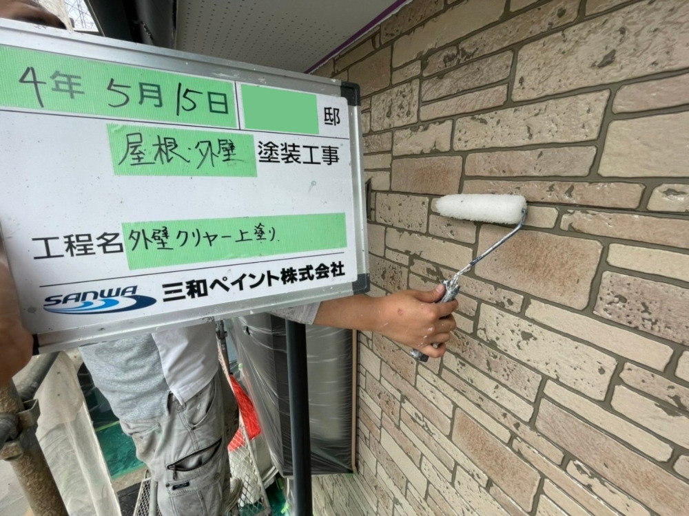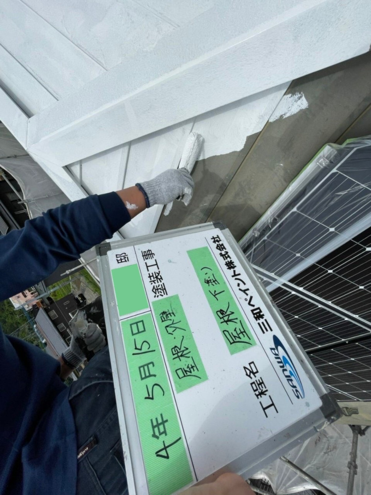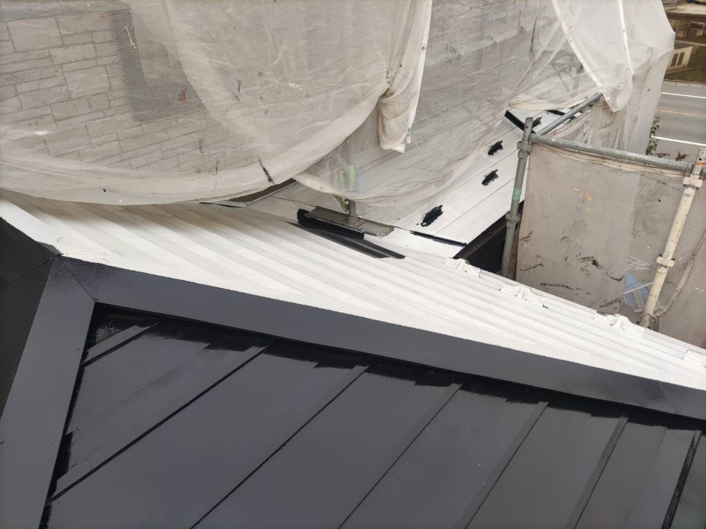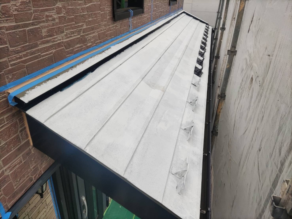 金属瓦が使用されていて、耐久性には優れていますが、どうしても夏場は暑くなりやすいです。なので今回は遮熱効果の高い塗料を選定させて頂きました。下塗り材(白)自体に遮熱効果が付与されていて、下塗り材を塗り込むだけでも減熱効果が期待できます。その上に選んで頂いた色を中塗・上塗で使用していきます。