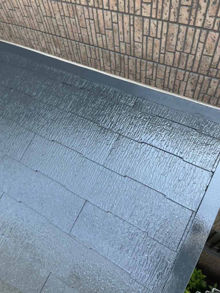 今回の屋根の形が特殊な屋根の形をしており、ペンキが飛び散らない様に、塗り残しが起こらないように注意して手塗りを3回に分けて塗装行いました。