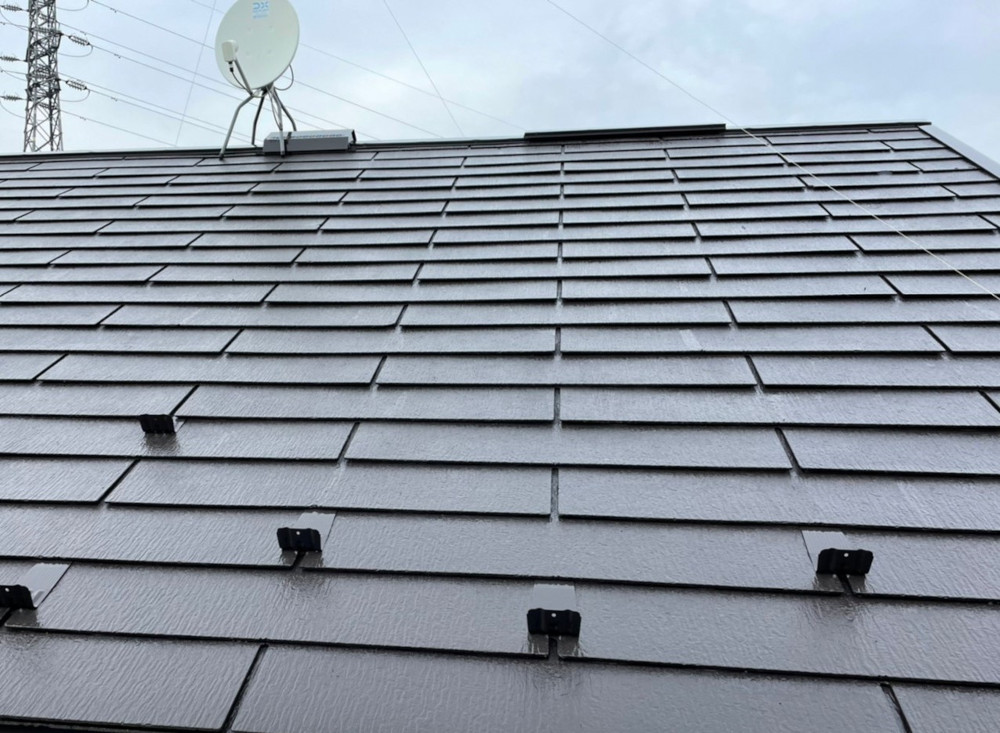 洗浄後に屋根のクラック(ひび割れ)に対してはシーリング材で補修を行い、屋根材の下地を整えた後に防水性能があるシリコン系の塗料で塗装を行いました。塗料の吸い込みが激しい箇所に対しては通常2回の工程のところを3回以上の塗装を行いました。
