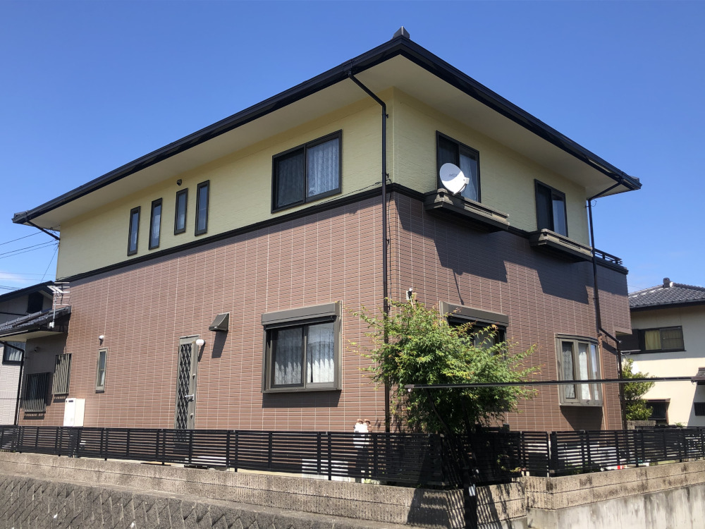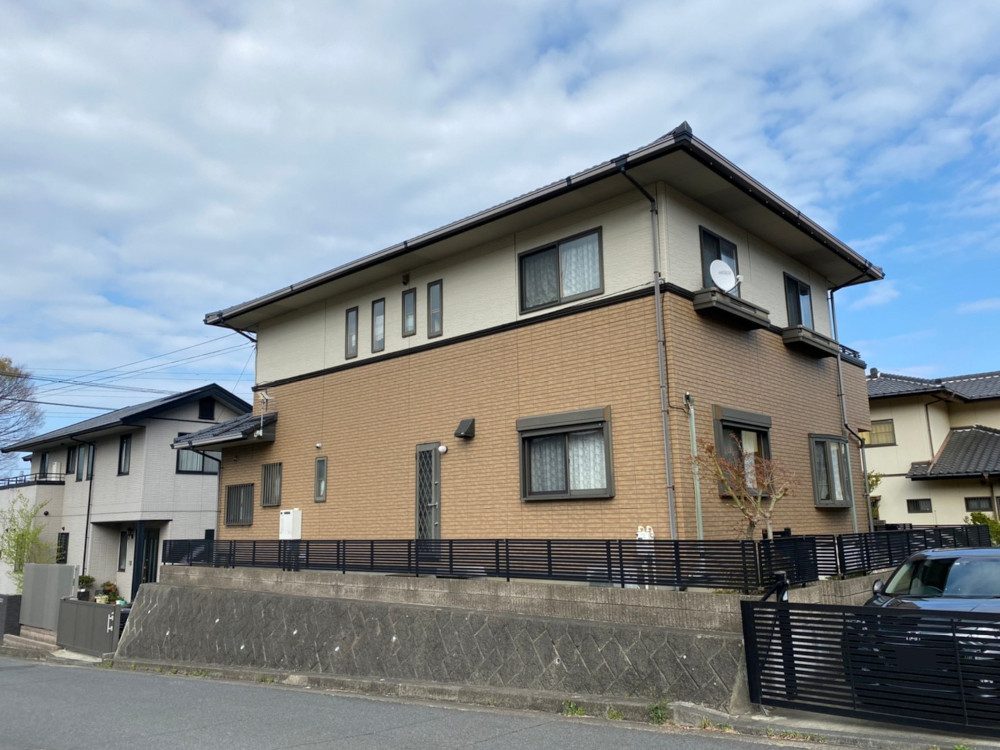 目地と外壁(タイル部分)の色分けをするダブルトーン工法を行いました。目地をグレー系、タイル部分を茶色系で色分けを行い、メリハリのある仕上がりになるように施工させて頂きました。