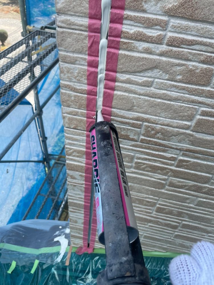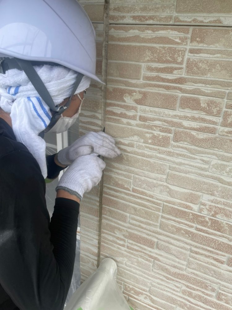 塗装終了後後打ち指示の為竪目地撤去は、問題なくできたのですが、場所により竪目地バック材が無い場所が多く、玄関柱の竪目地やベランダ正面そしてコーナー縦樋部補修にとても時間を費やしてしまった。バック材ない場所は新規に入れる作業や ベランダ面の目地の開きが大きく仕上げにとても時間がかかった。