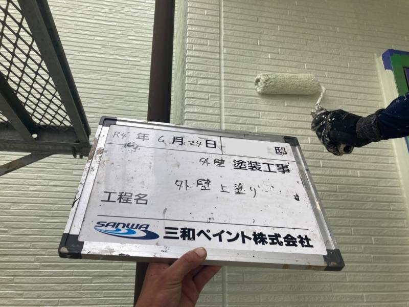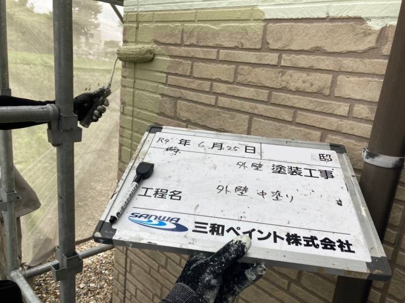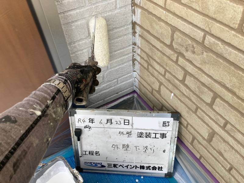 外壁と屋根の洗浄と養生が終わった後に下塗りを行いますが、塗装をする上で下塗りが1番大切になってきます。理由として築7~8年経つと防水の効果が無くなるので今ある傷みを守ってあげる必要があります。