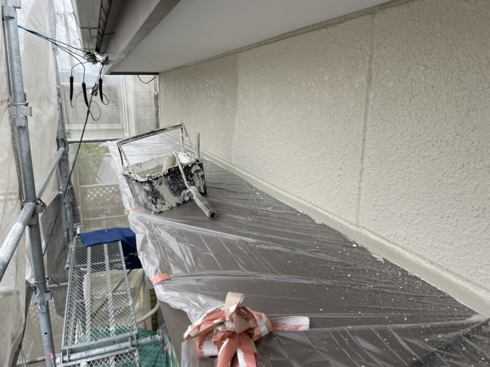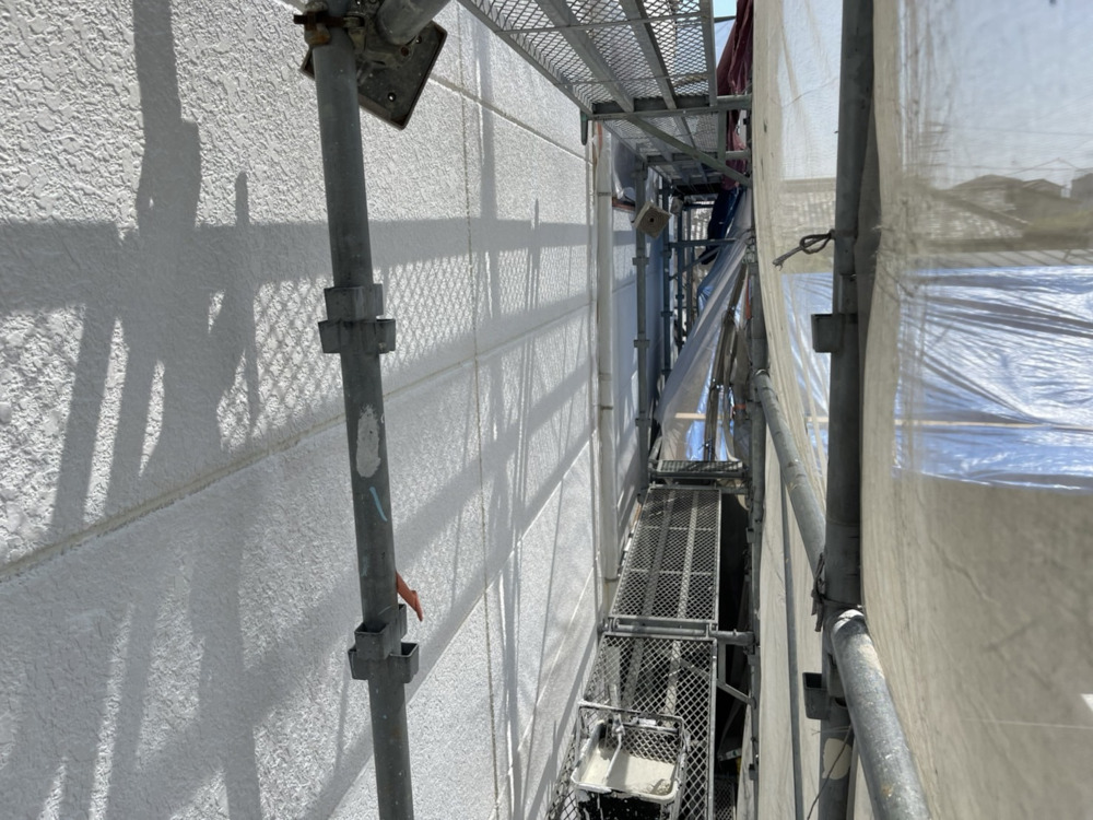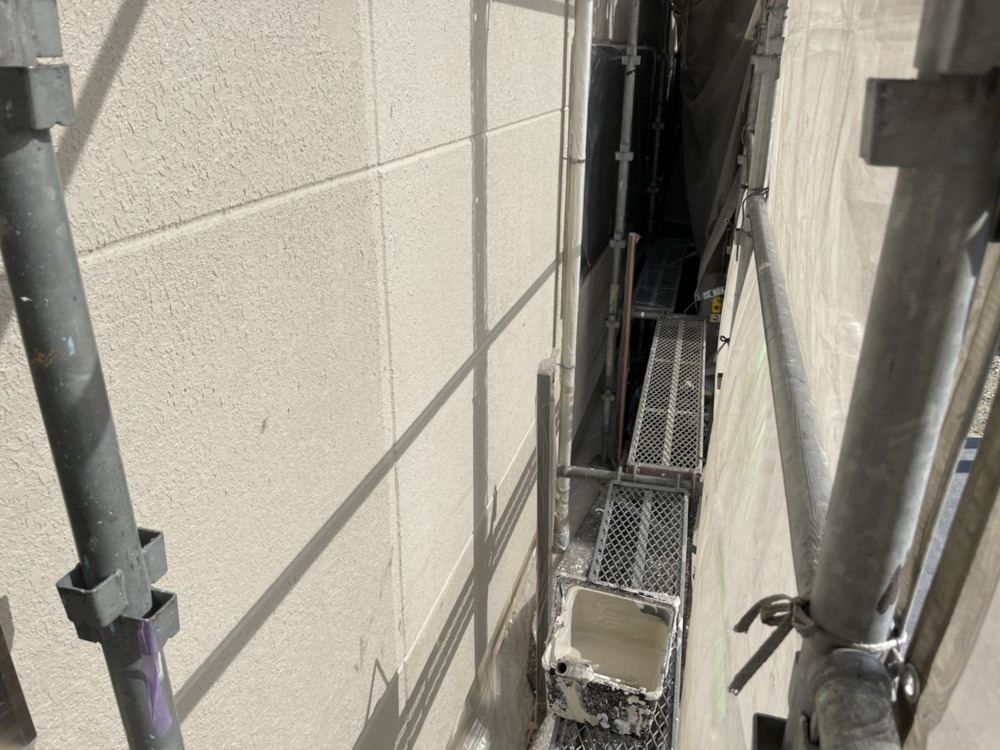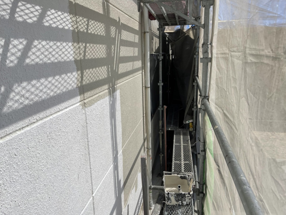 西面がお隣様の駐車場に入らないと足場が立たず、境界線の上にお隣様のフェンスが立っていました。当社の方でフェンスを外させて頂くご了承のお願いをし、足場組立をしました。また東面も人が通れない箇所があり、別のお隣様の建物の2階に足場を乗せさせて頂くよう、ご了承を得るなどの調整を致しました。
