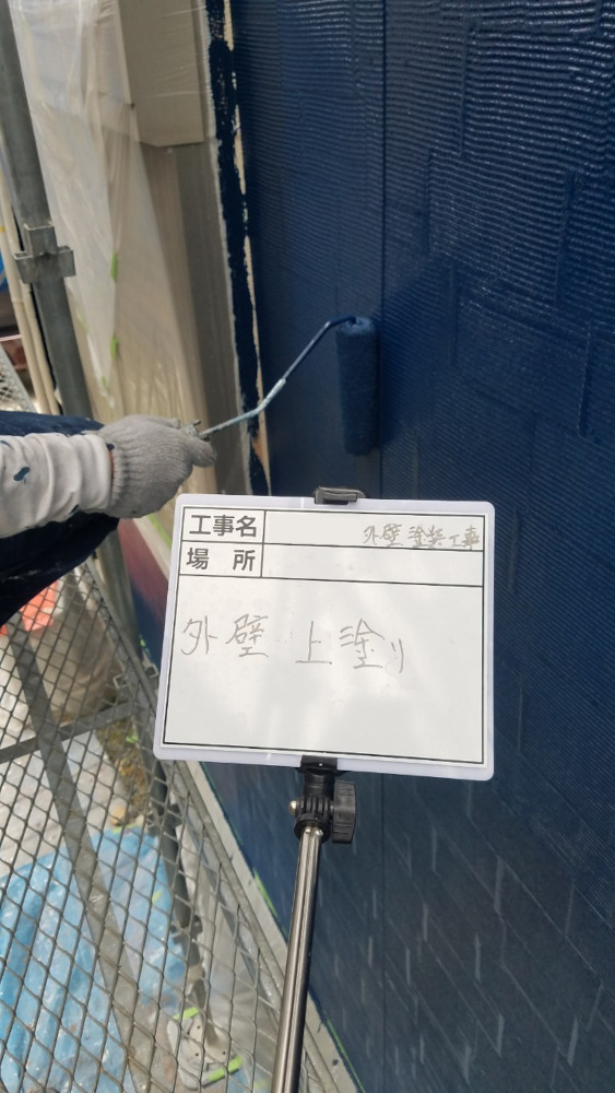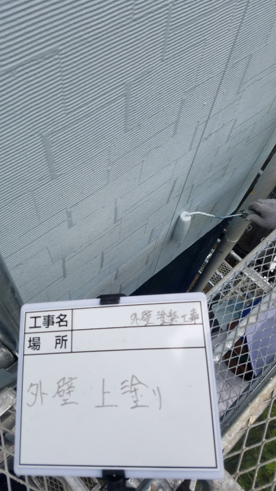 今回はグランコートシリーズの新色である2色を用いての施工だったため、2トーンのラインをどこで切るか?施主様や担当者とも打ち合わせて最も映えるラインで施工しました。またSP-475のように濃厚な色は、油断すると下地の色が透けてしまうこともあるため、何度もダブルチェックを行いました。