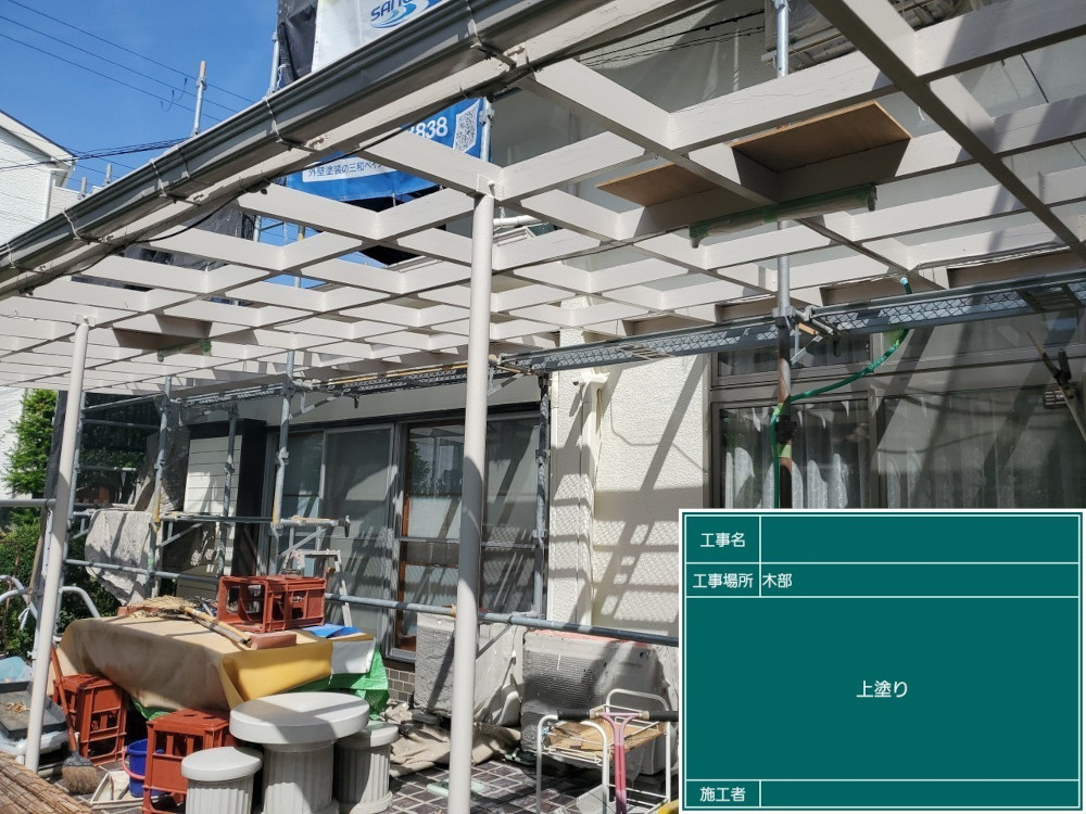 施工詳細❸(駐車場のエクステリア鉄部塗装と庭のテラスの木部塗装と波板交換40枚の交換作業)