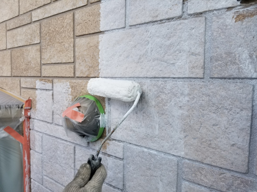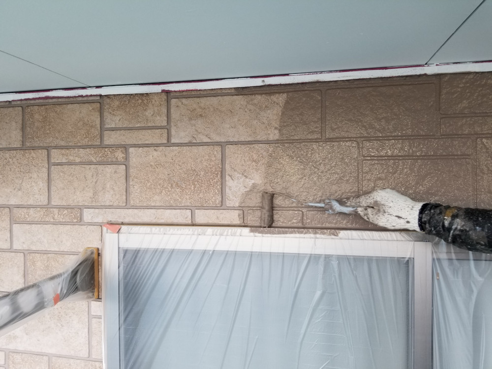外壁下塗りの乾燥状態を確認後に塗装を開始しました。今回の外壁のデザインの凹凸が多いので塗装がムラなく仕上がるように2重チェックを欠かさず、仕上げました。