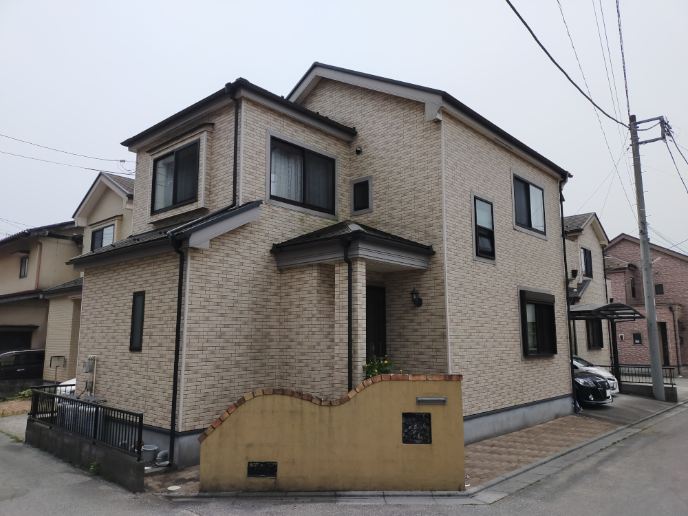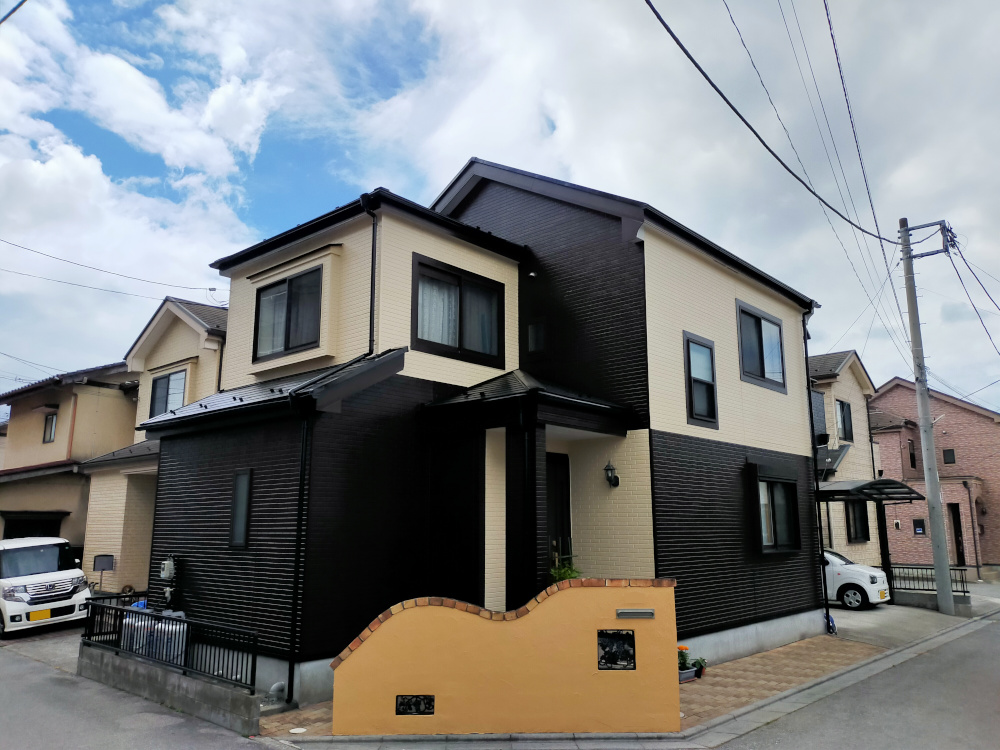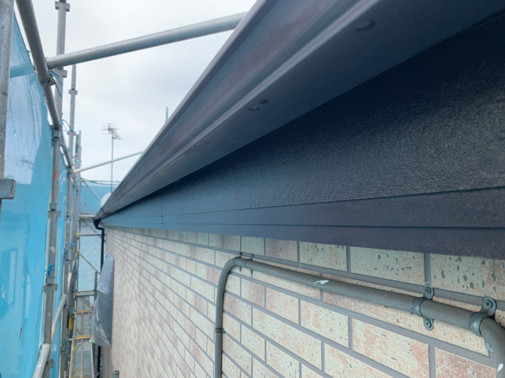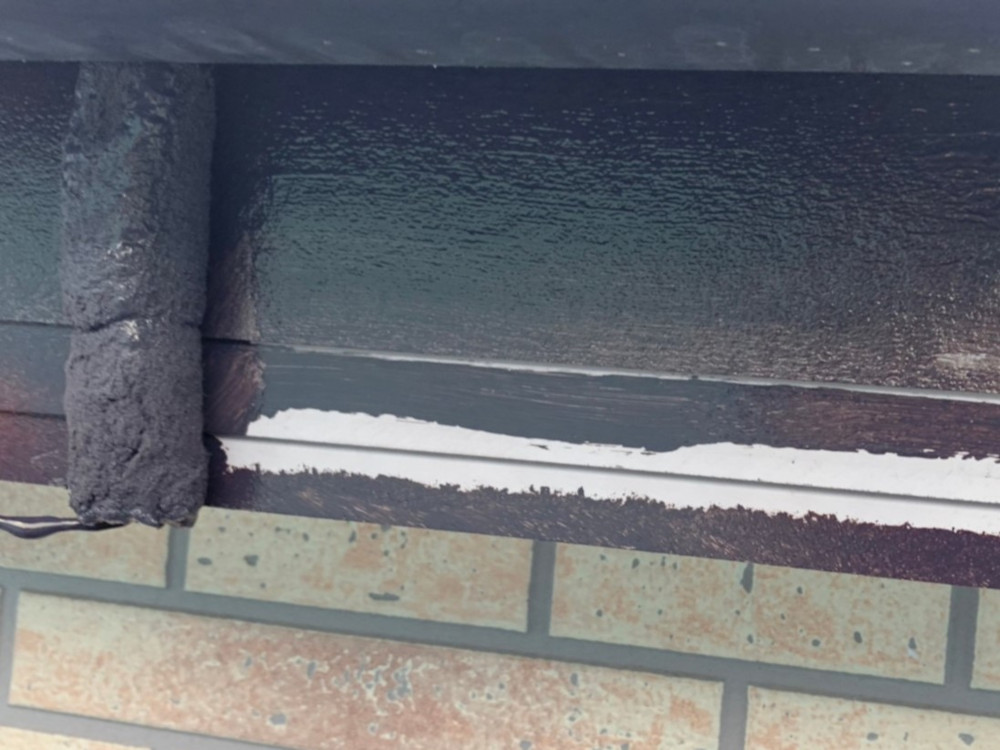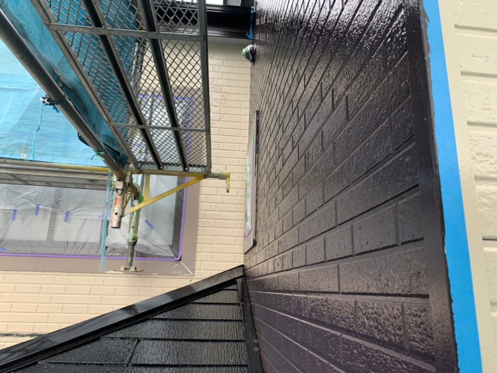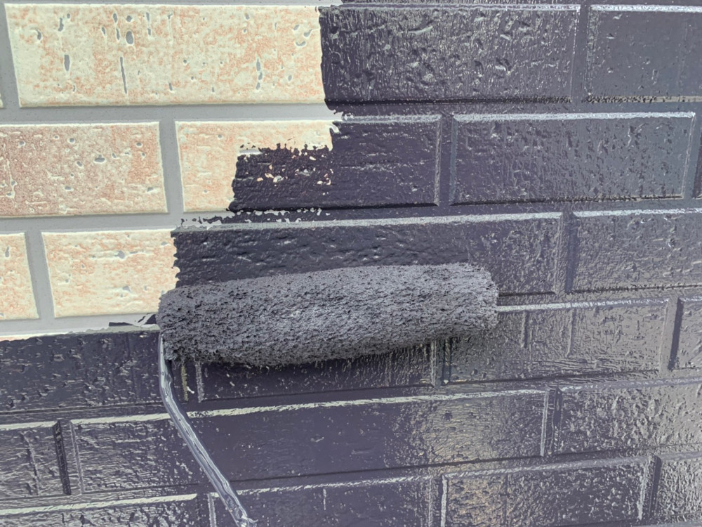 外壁下塗りの乾燥状態を確認後に塗装を進めました。今回は2色の配色で塗装を行うお住まいでしたので、色分け部分を先に塗装してライン取りをした後に全体の塗装に進みました。