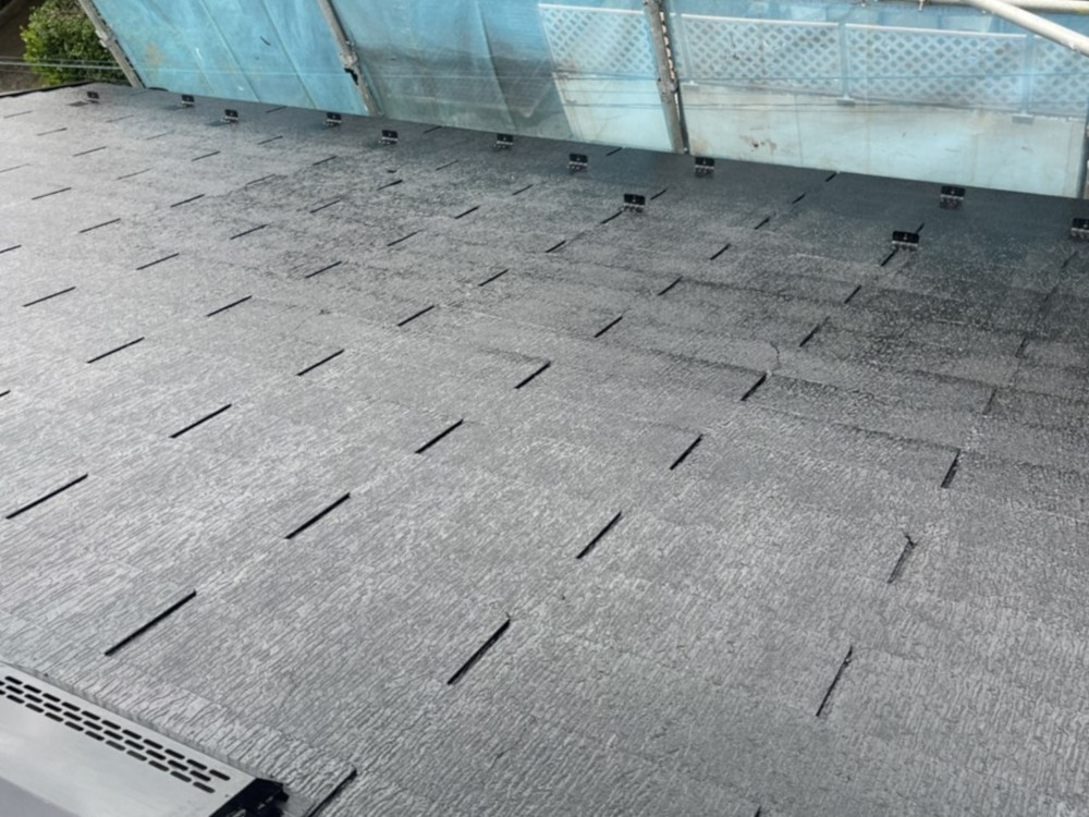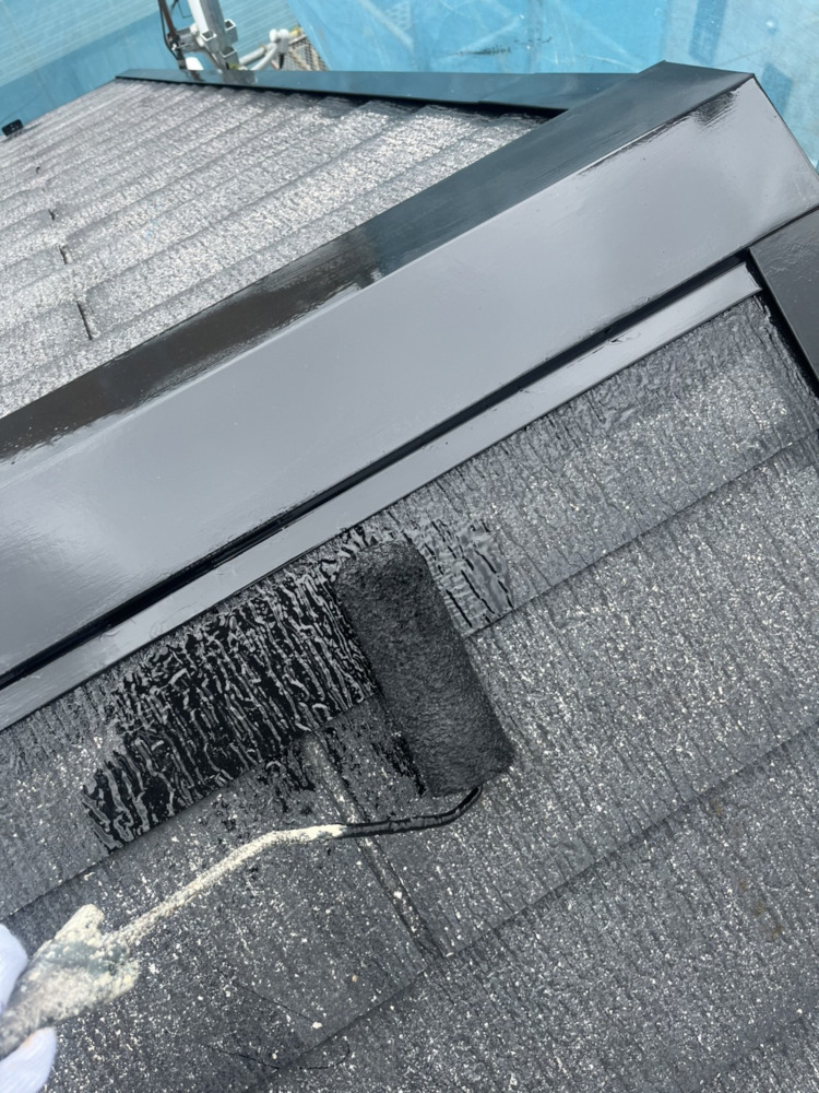 下塗りの乾燥状態を確認後に、屋根材の凹凸面の塗料が入りずらい場所から塗装をハケで行い、その後ローラーで全体の仕上げを行いました。