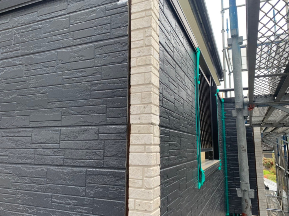 施主様の希望により特注色(N-30、黒グレー)での工事をさせていただきました。濃い目の色であるため、中々色が仕上がらず基本は中塗り、上塗りの2工程で仕上げるところを3回、4回と仕上げる所もありました。最終は職人さんも納得のいく工事となりました。