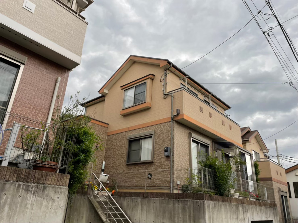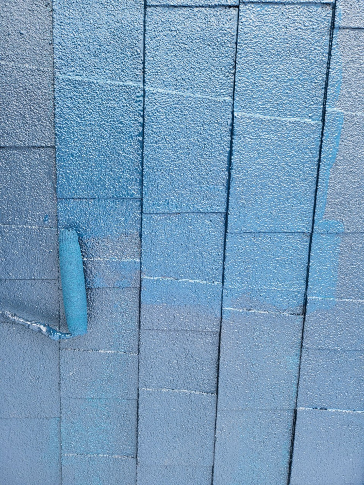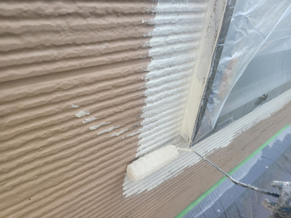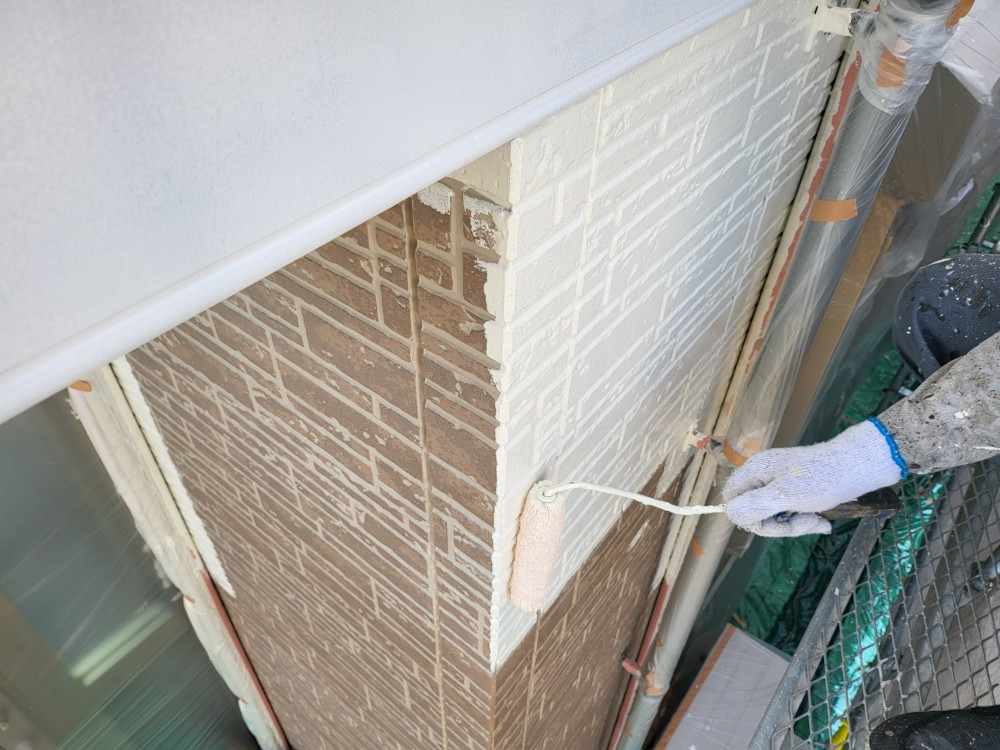 細かい亀裂や色あせ等、年数なりのお傷みが見受けられたので、建材にしっかり浸透するように念入りに作業を行いました。この下塗をしっかり入れることで中塗り・上塗りの効果を性能通り発揮することが出来ます。