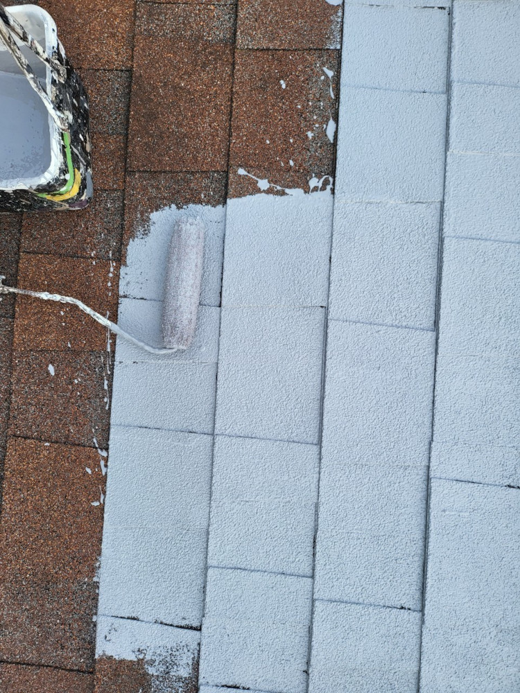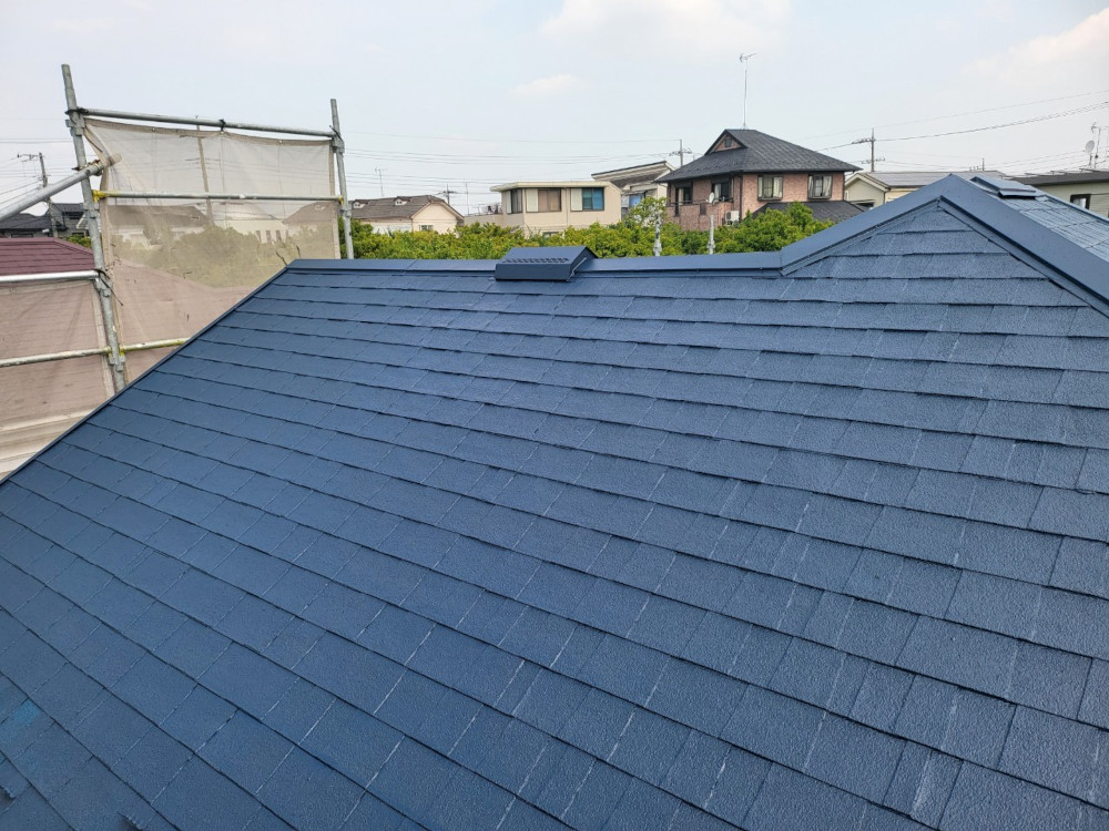 築13年経過したアスファルトシングル屋根は砂利が落ちて雨樋に溜まっている状況でした。しっかり下塗で目止めを行い、上塗を行うための下地を作る重要な工程となっております。