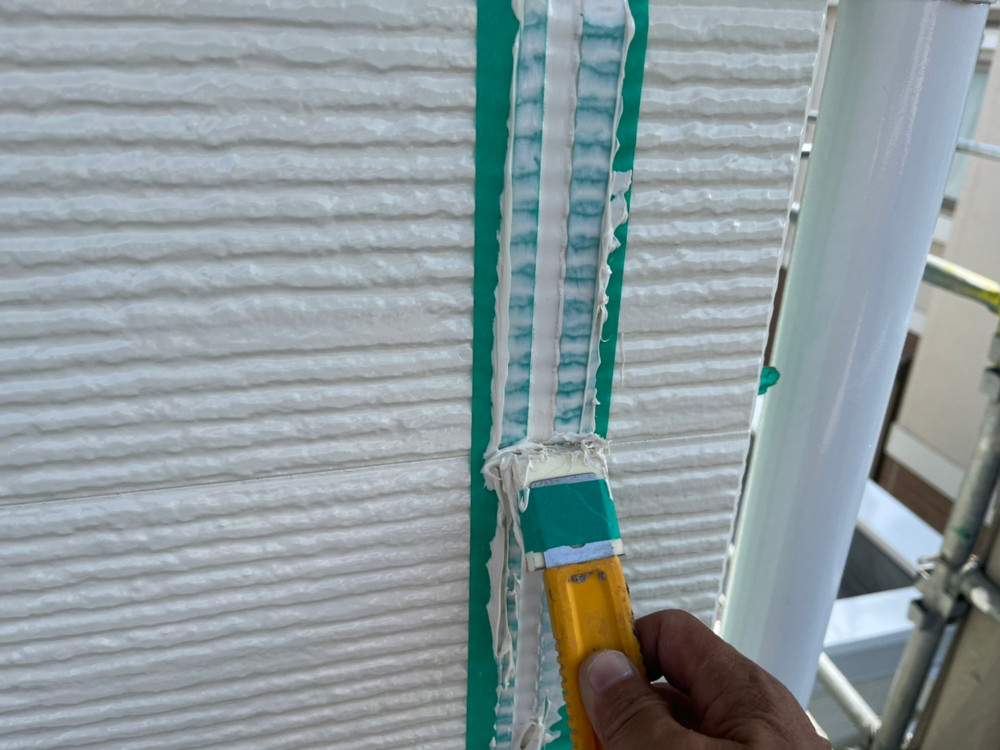 ひび割れや痩せが目立っていた旧コーキングを撤去し、新しく打ち直しました。コーキングは防水面で非常に大きな役割を果たす部分なので丁寧に線出しや均しを行いました。