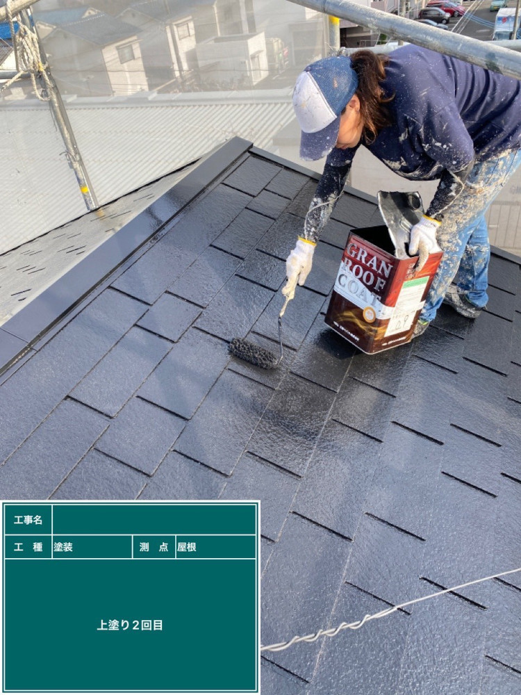 屋根の割れている部分は割れの補修をし、一番紫外線が当たる部分で、より傷みの症状が出やすいので、塗膜の厚さをきちんと乗せ、日ごろの紫外線だったりを守るように心をこめて施工いたしました。
