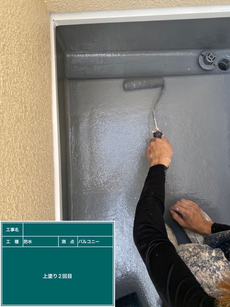 元々ボコボコしていた箇所などをケレンし、綺麗にした後、密着がよくなるプライマーを塗り、ベランダの防水がより長持ちするように心を込めて施工いたしました。