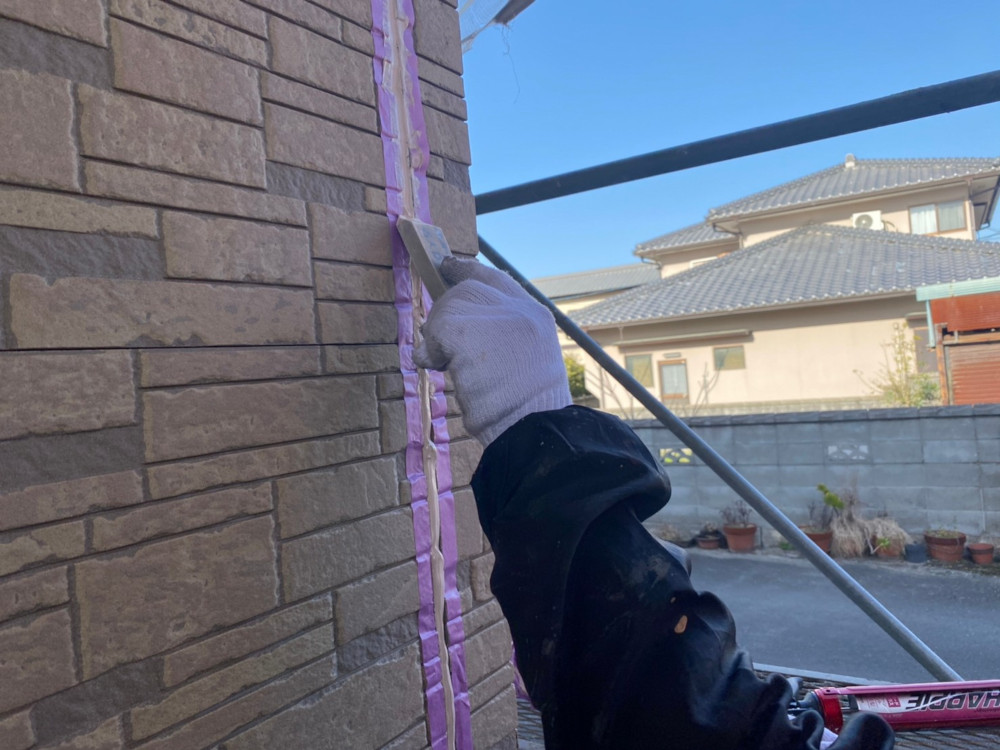 今回、一般的な表面に凹凸がないデザインの外壁に比べて、レンガ調で凹凸の多いデザインでしたのでコーキング充填後のならし作業が大変でした。このならし作業を雑に行ってしまうとコーキングが余計な部分に広がって仕上がりが不格好になってしまうため、へらを用いて凹凸に沿うようにゆっくりと行いました。