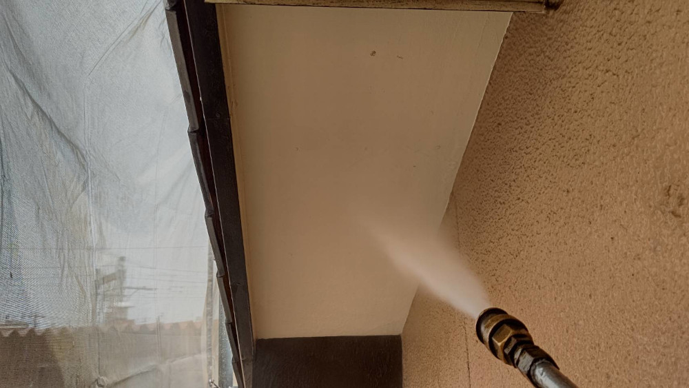 外壁面に付着した埃や昆虫の巣の除去や旧塗装膜が経年劣化でチョーキングによる粉吹きの状態の為に高圧洗浄機を使用して可能な限り洗い流していきます。