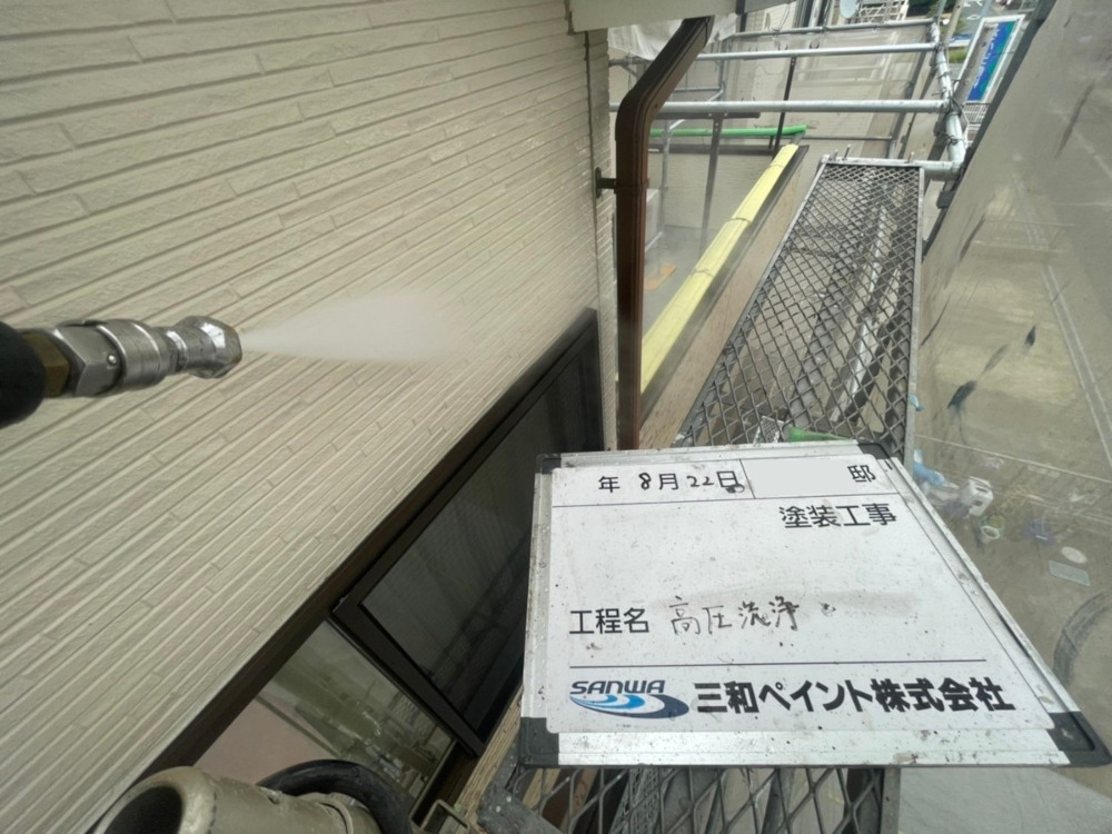 塗装工事を入る際はまず初めに足場を組んでメッシュシートをかけた後に、外壁と屋根の洗浄(水洗い)を行います。洗浄することにより、この後の塗装の工程で実際に塗っていく作業の時に本来の耐久性を保てます。
