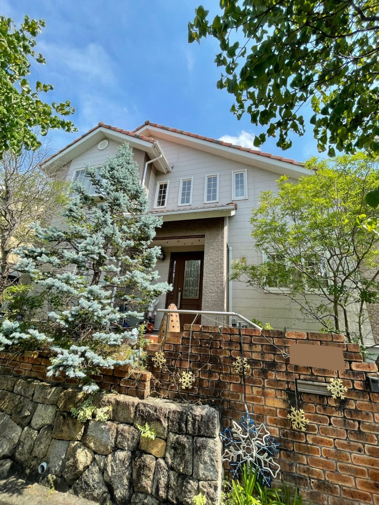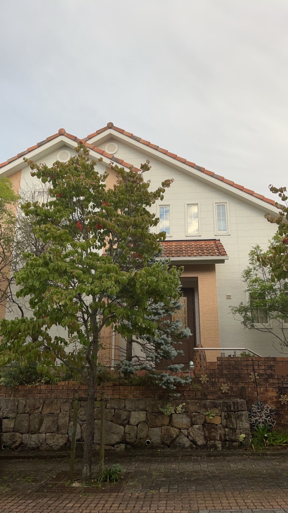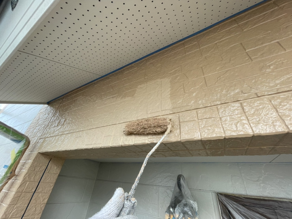 外壁塗装の上塗りです。ツートンで屋根は塗らずだった為、現状色のまま屋根に合う色でご提案させて頂きました。