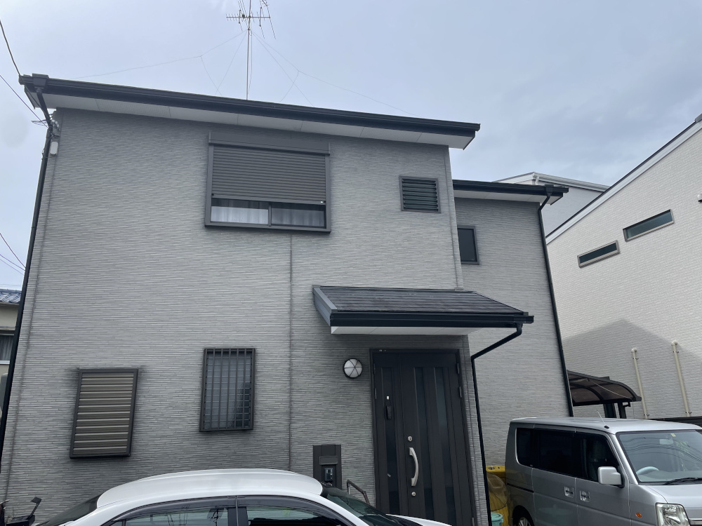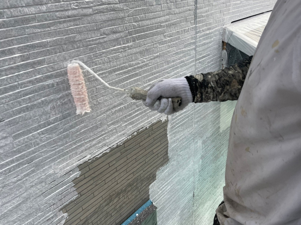外壁のボードがだいぶ傷んでいたので、下塗りにはかなり力を入れて作業を行いました。これ以上傷まないようしっかりと防水をつけて丁寧に塗りました。