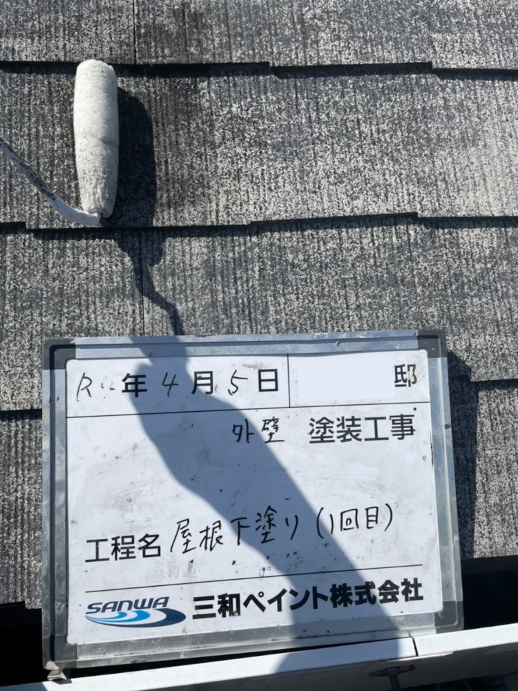 高圧洗浄して乾かした後、年数が経っているお住まいは、屋根が白くなっている事があるのでしっかり下塗りを塗布する事で中塗り、上塗りの性能を向上させます。