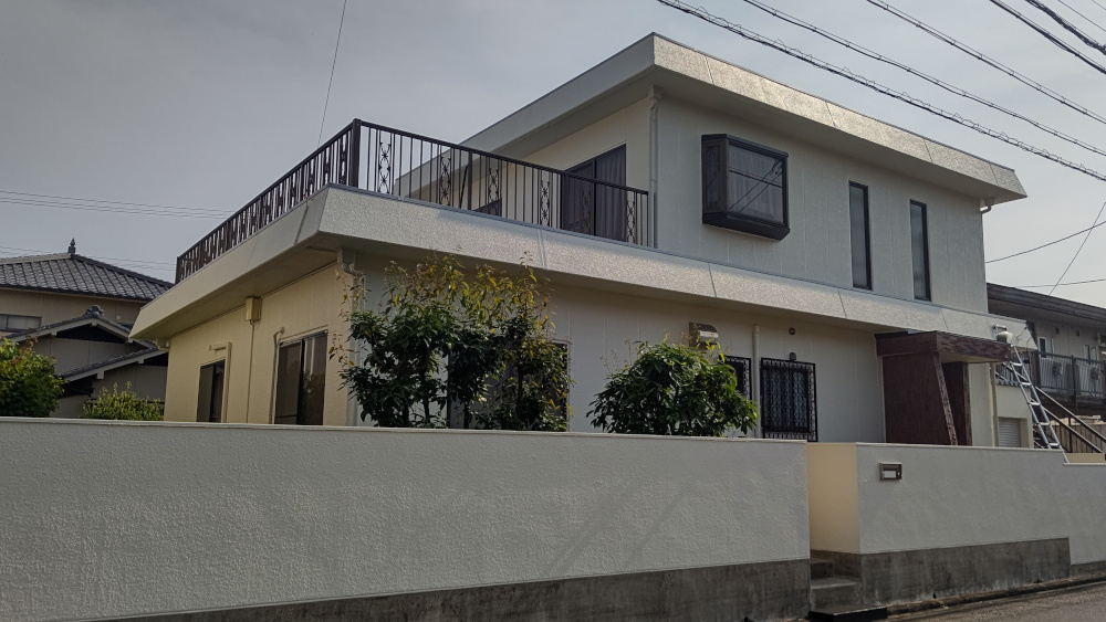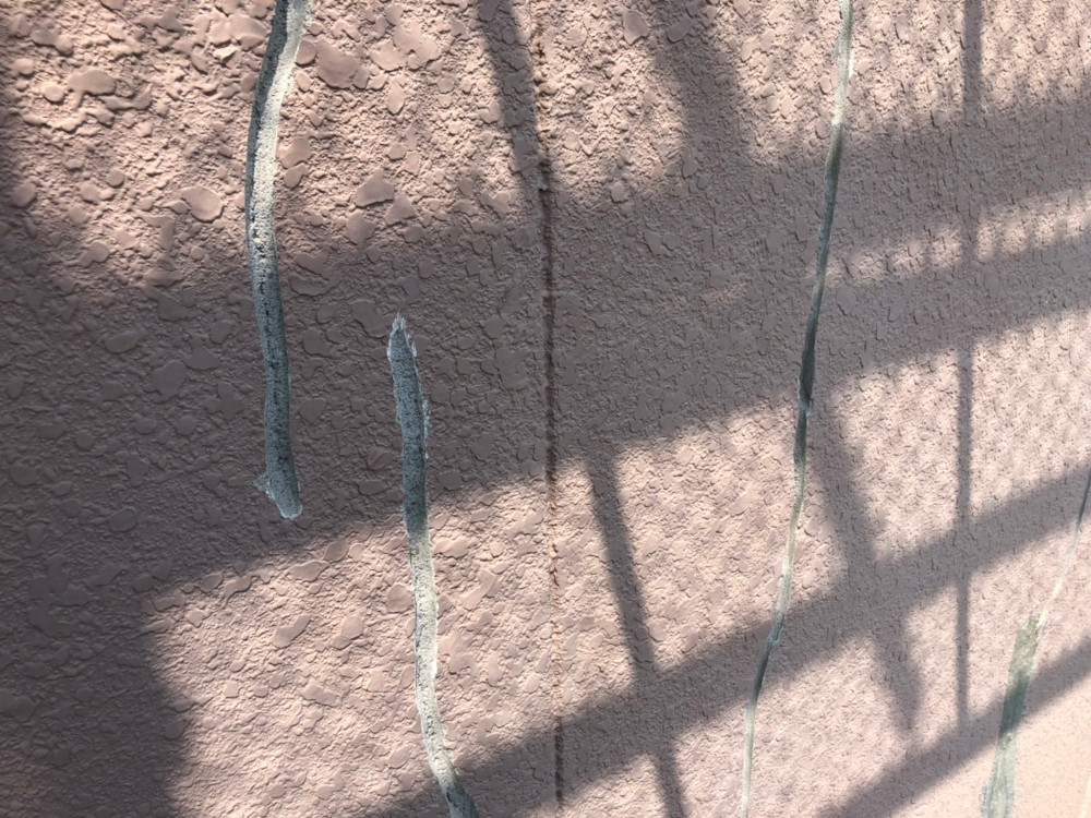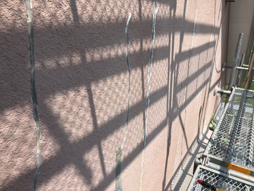 地震等の影響によりモルタル外壁に亀裂が見受けられ、将来雨漏りに繋がるのではとの懸念から下地補修をしっかりと行いました。亀裂をV字カッターで削り、細かな隙間はコーキング、大きな亀裂にはセメントで埋め、ボンタイルの外壁模様も復旧いたしました。