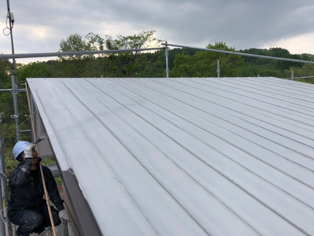 洗浄、錆ケレン工程を終えた後、錆止め作用のある塗料を屋根板金全体に塗装します。中塗り・上塗りの光沢仕上がりを左右する下塗りもムラなく均一に職人の手塗りで施していきます。