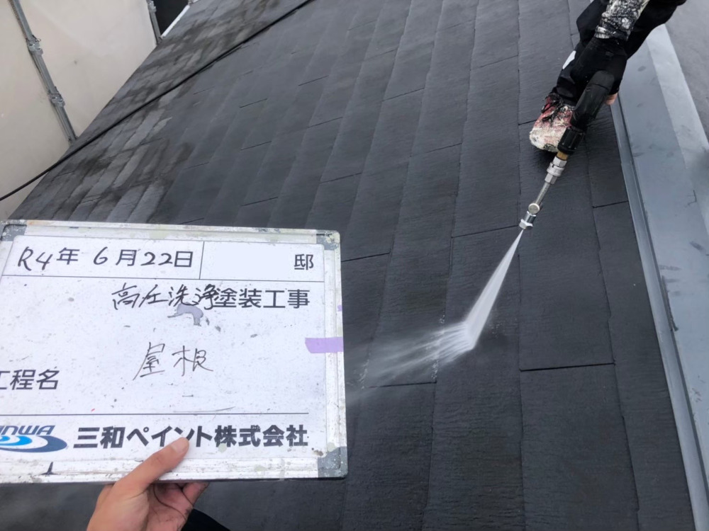 塗装の仕上がりや耐久性を上げる為に、まず外壁と屋根に付着した汚れを綺麗に落としていきます。