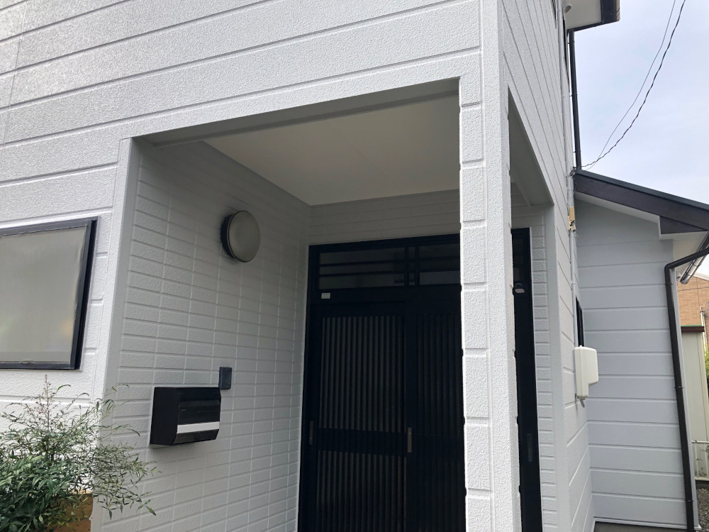 付帯塗装として玄関天井を塗装させていただきました。黒ズミができていた部分も綺麗に白く仕上がり、外壁の色ともマッチしていて、明るい印象になりました。