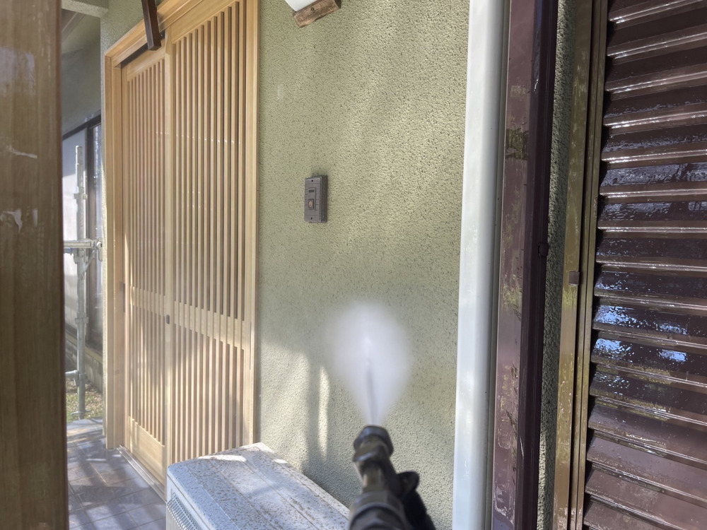 職人さんが、壁や屋根はもちろんのこと雨戸や戸袋、樋の中まで綺麗に高圧洗浄をしています。下塗りなどの塗料を載せる前にしっかりと今まで蓄積していた汚れなどを落とし、塗料がつきやすいようにしています。