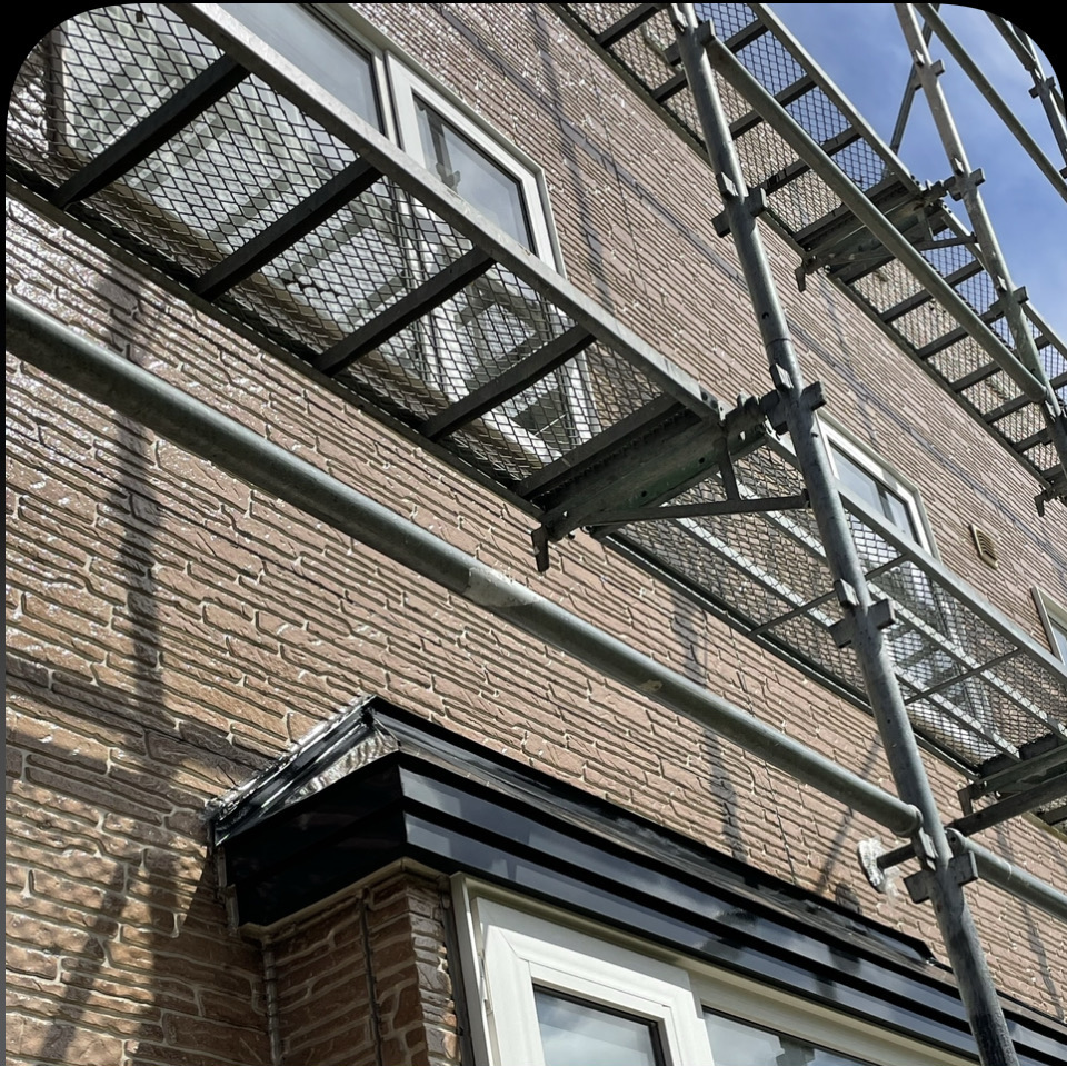 外壁洗浄の次の日に養生してまずクリア塗装1回目塗ります。3時間程乾くのを待ってクリア塗装2回目を塗ります。特に2回目塗る時は職人が同時進行して塗り忘れないように注意しながら作業行います。