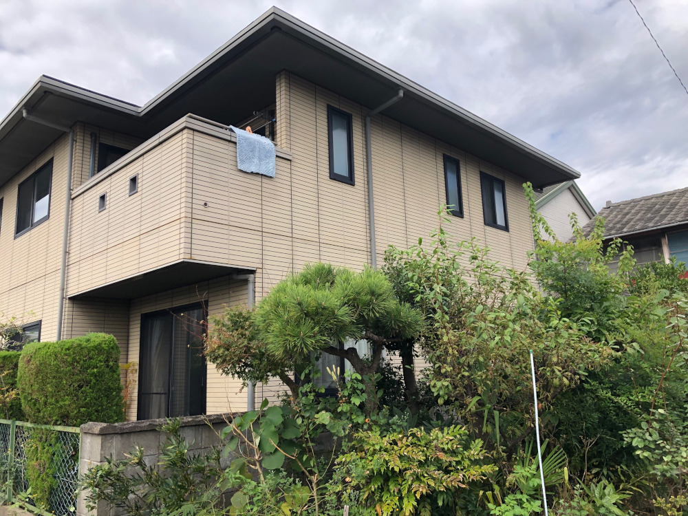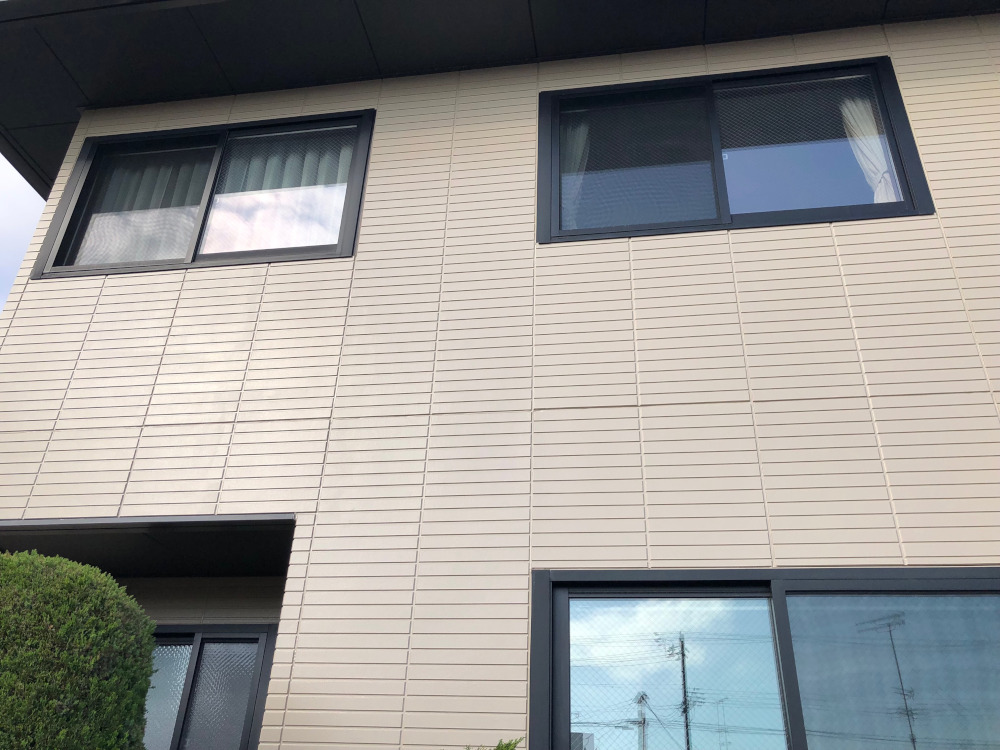 外壁の上塗り工程です。凹凸のあるパネルボード外壁でしたので、塗り残しが出ないように注意しながら丁寧に作業させていただきました。