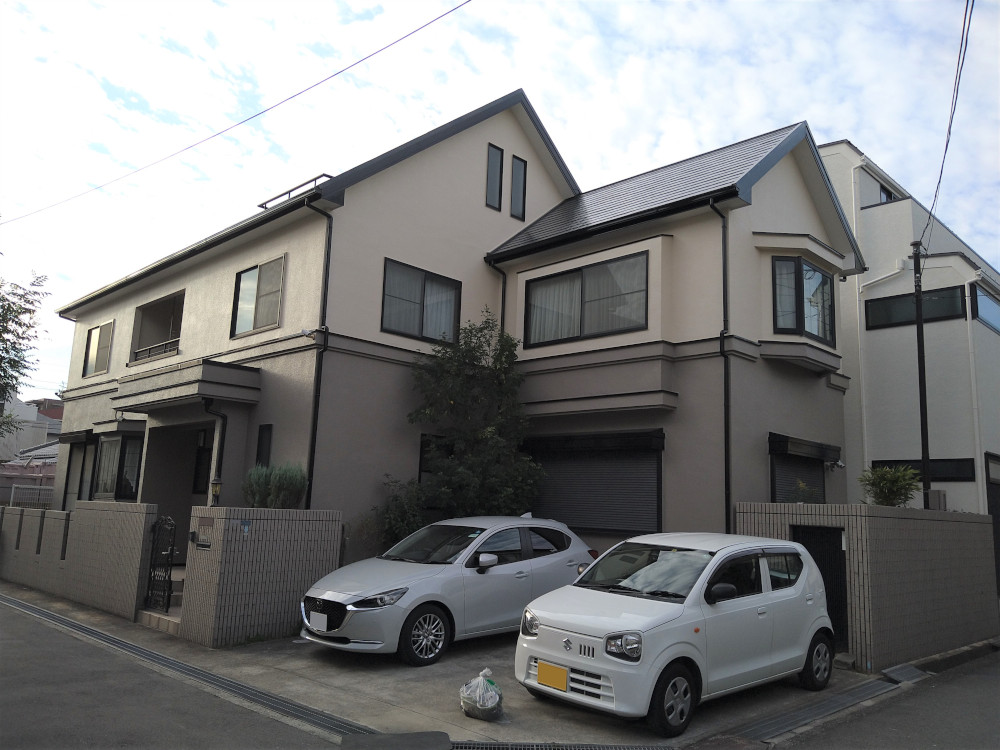 1階と2階の色を変え、ツートンカラーにしました。2階は白系のベージュで、1階は茶色系の明るめの色にしました。下塗りに弾性系の塗料を使い、中塗り・上塗りは、紫外線に強い塗料を使用しました。