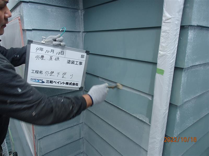 外壁の下塗りは塗装をする上で初めの大事な作業でしたので、塗り残しが無いようしっかり確認を念にし作業できました。