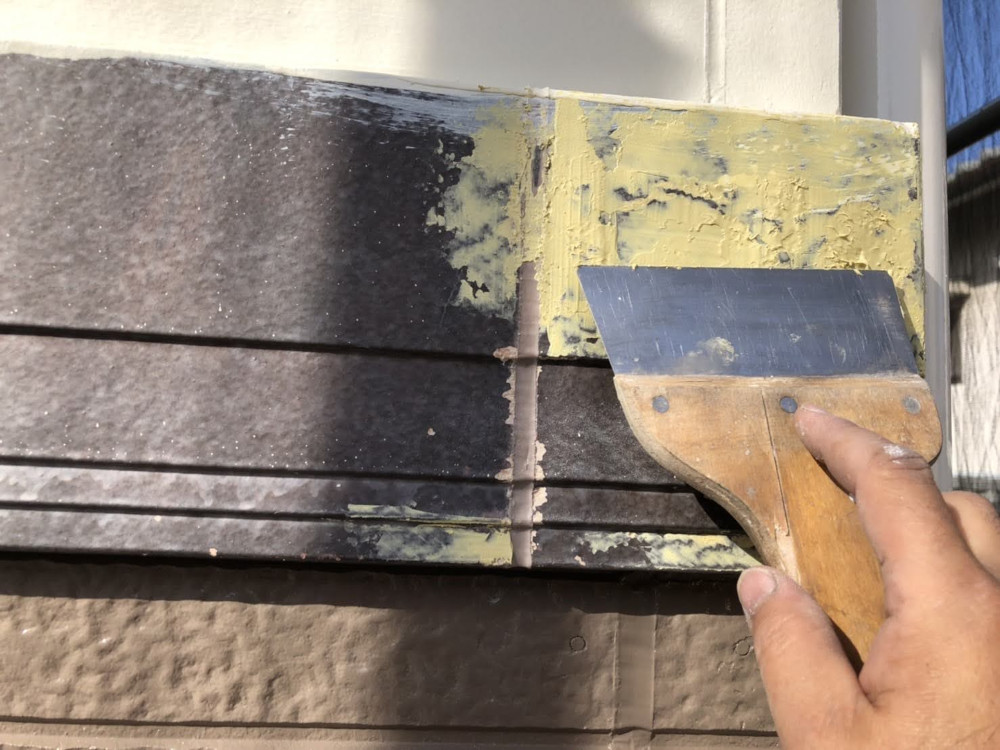 経年劣化により、幕板の表面が削れ下地が傷んでしまっている状態でした。表面を平らにして塗装するためにパテ補修を加えました。