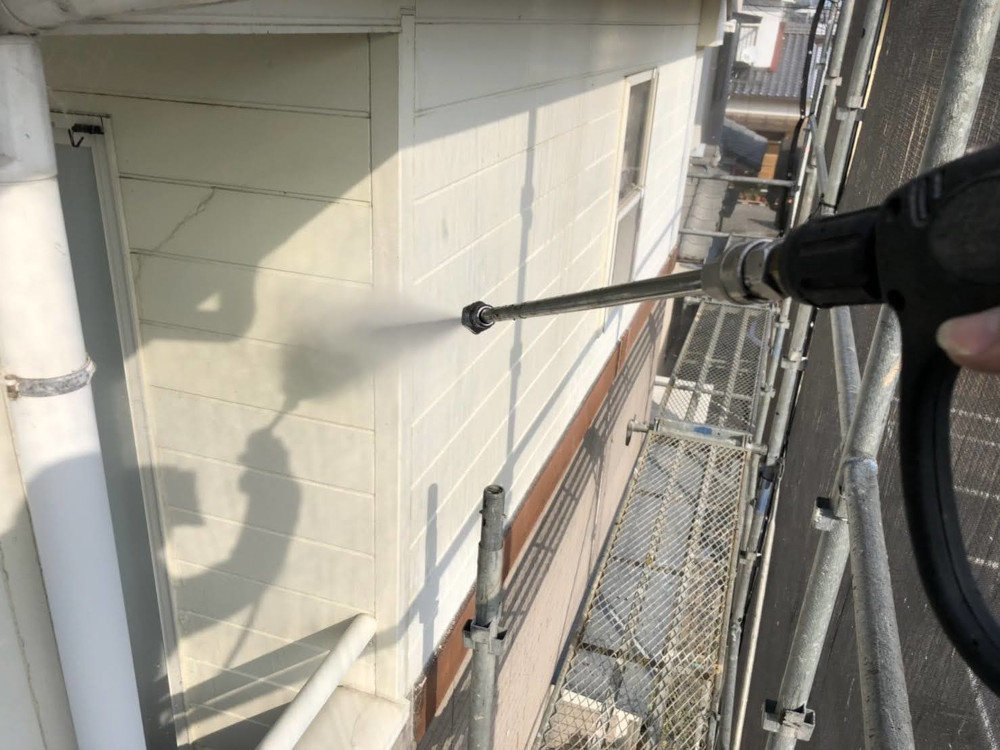 洗浄は本来一回で完了する作業なのですが、今回は外壁の素地の傷みが激しく表面の剥離がみられたので2回行いました。それによって素地の剥離部分を完全に撤去したうえで、塗装作業がスムーズに完了しました。