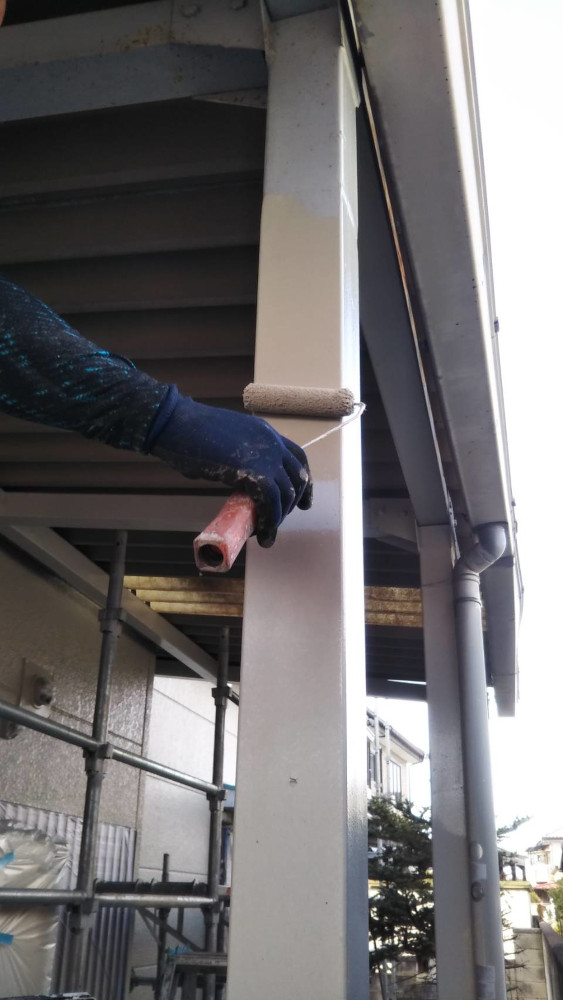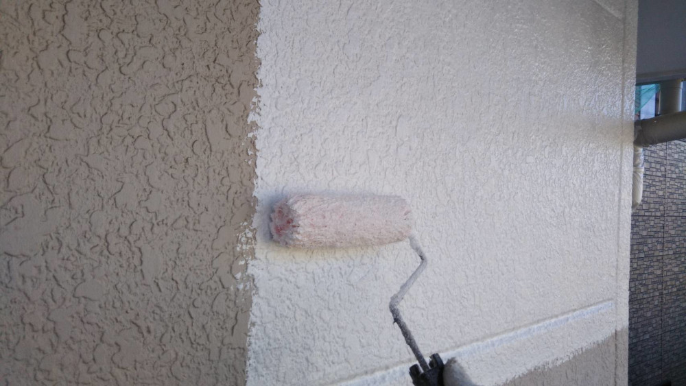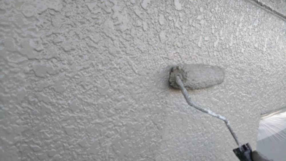 過去に塗装を実施済みでした。しっかりとした塗装をする上で必要な行程です。外壁の表面の洗浄し乾燥後に初めて塗装前の下塗り(外壁と仕上塗料の密着性向上アップ)を行います。現在の外壁が真っ白く変わります。高分子の下塗りを利用することでしっかり壁に浸透し今後の塗装との密着を強くしていきます。