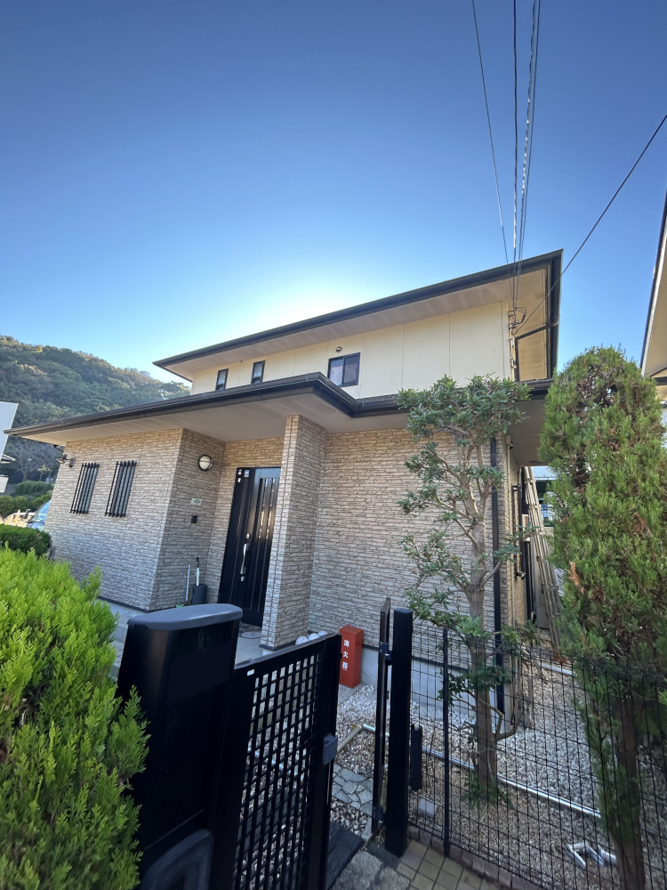 新築時、1階の外壁の柄選びにとても拘り決めた石調の柄との事でした。1階が石調柄で2階がベージュの2トーンのイメージを変えないように仕上げました。