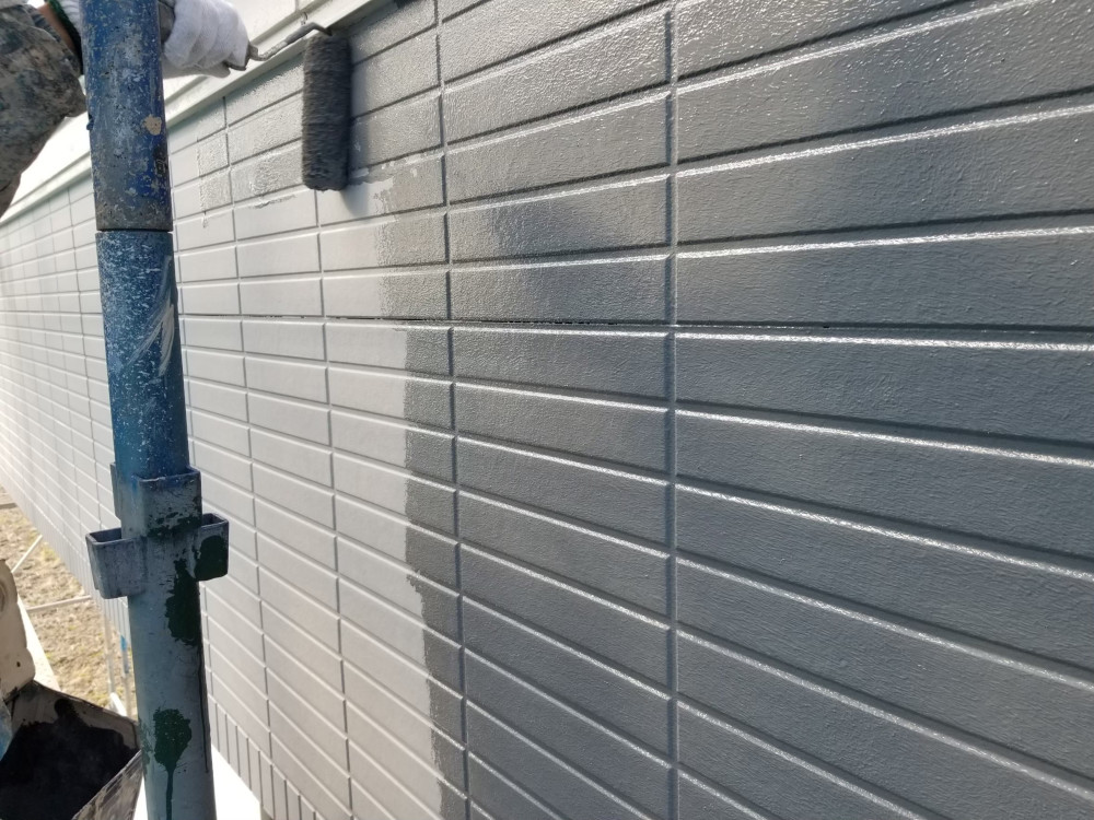 外壁の防水性能を向上させる大切な工程の為、下塗りの乾燥状態を確認後に施工を進めました。