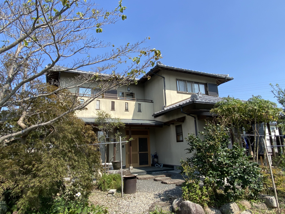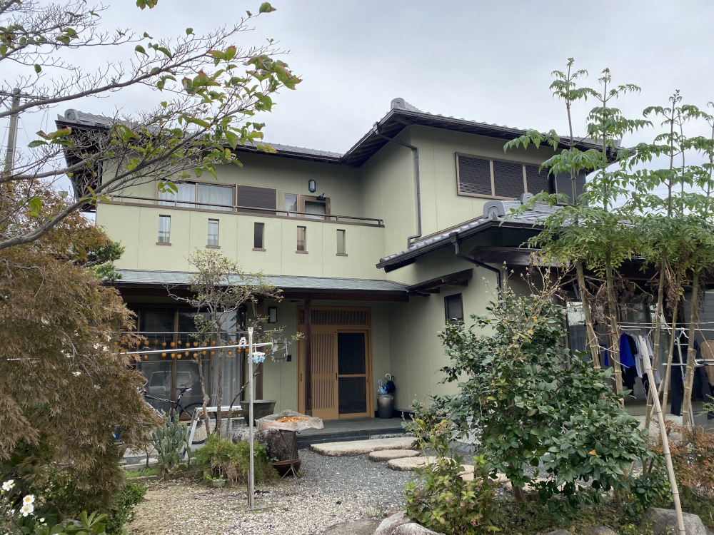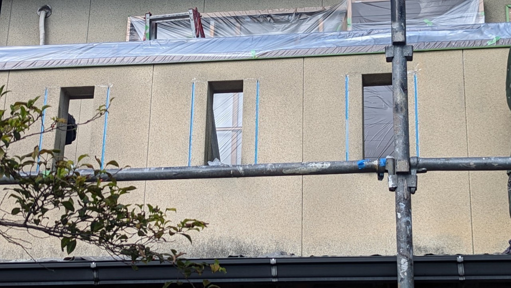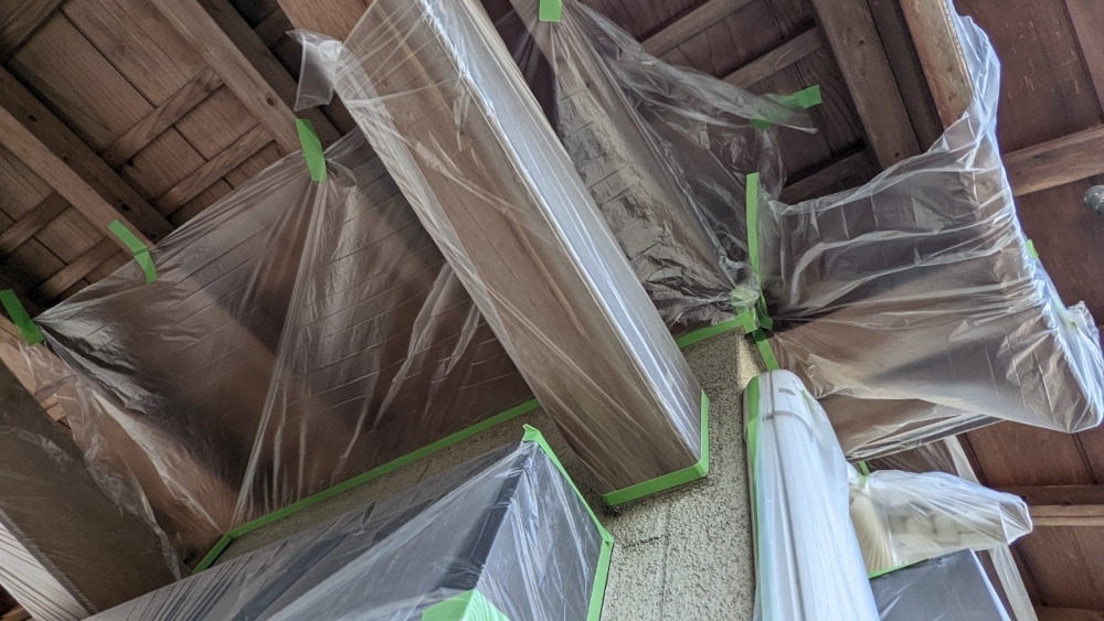 純和風のお住まいのため、窓などの開口部が多いのと軒天や玄関柱などの木部も多いので塗料の付着、飛散が予測できる範囲はすべて養生します。塗装する箇所以外に塗料が付着しないようにビニール等でカバーさせて頂きました。